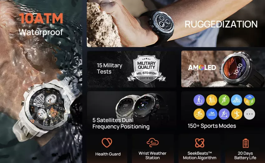 Funkcje zdrowotne obejmują możliwość monitorowania tętna i poziomu tlenu, a także wybór spośród ponad 150 trybów sportowych. Zegarek oferuje również funkcję nadgarstkowej stacji pogodowej dla szczegółowych prognoz pogody.