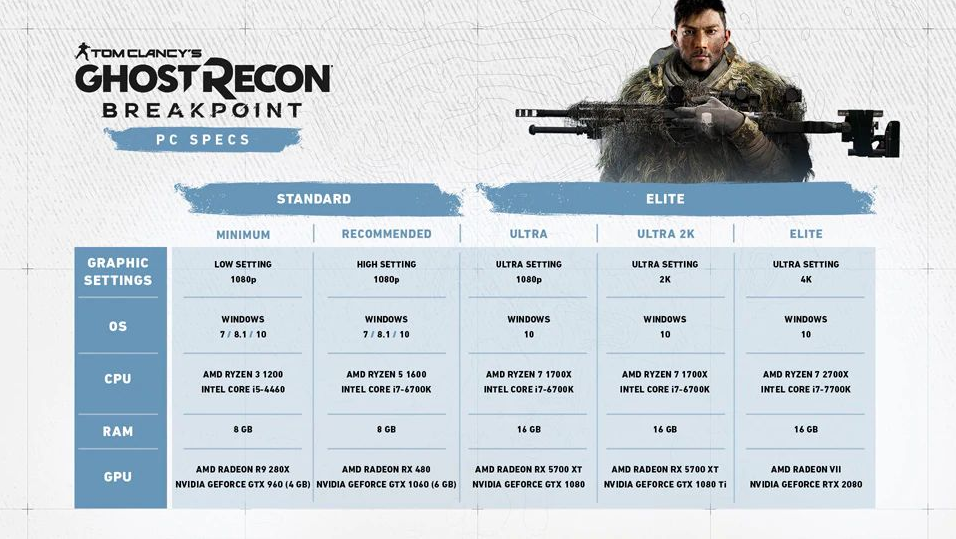 Aby uruchomić Breakpoint przy minimalnych ustawieniach graficznych, potrzebujesz Core I5 4460, 8 GB pamięci RAM i karty graficznej nie gorszej niż Geforce GTX 960 przy 4 GB. Ubisoft zaleca grę z Core I7 6700K, 8 GB pamięci RAM i 6 GB Geforce GTX 1060. Minimalne i zalecane wymagania systemowe określają Windows 7, 8.1 i 10, ale w „Ultras” gra zaczyna się tylko z najnowszą wersją systemu operacyjnego Microsoft.