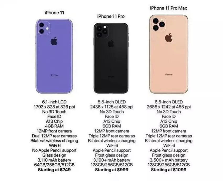 Wszystkie trzy otrzymają procesory Apple A13 ulepszony Face ID, bezprzewodowy dostęp do Internetu (Wi-Fi 6), 12-megapikselową kamerę przednią, szklaną obudowę i wspieranie wstecznego ładowania.