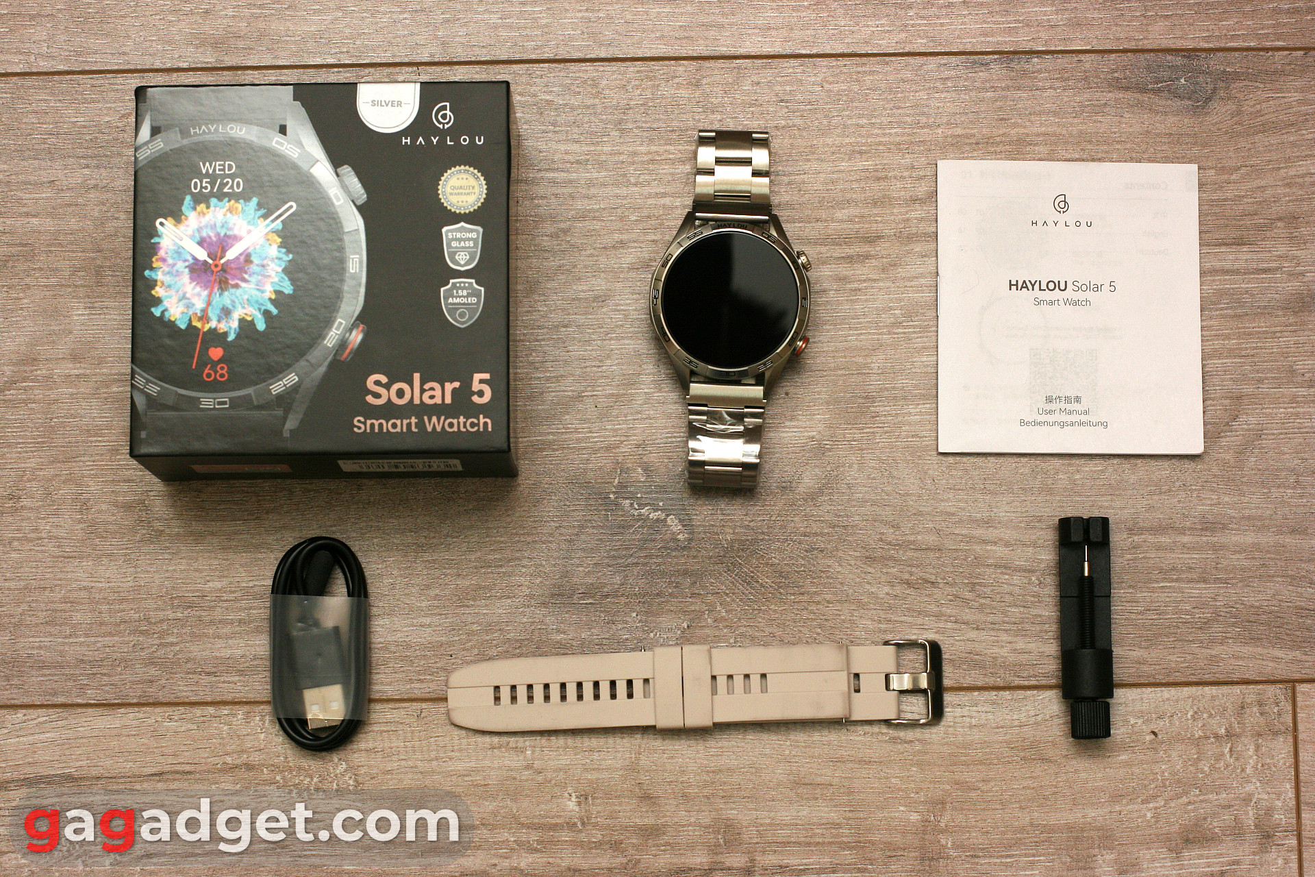 Haylou Solar 5 jest dostępny w kilku opakowaniach, które różnią się kolorem obudowy zegarka (czarny lub srebrny), a także paskami. W naszym przypadku srebrny zegarek był dostarczany z metalową bransoletą, wymiennym silikonowym paskiem, narzędziem do regulacji bransolety, kablem do ładowania i minimalną papierową instrukcją obsługi. Dołączone narzędzie do regulacji bransolety jest przydatne, ponieważ bransoleta jest zaprojektowana dla najszerszego możliwego nadgarstka i w zdecydowanej większości przypadków wymaga skrócenia. Aby skrócić bransoletę, wystarczy nacisnąć trzpień mocujący za pomocą narzędzia i usunąć nadmiar elementów bransolety, a następnie połączyć przerwę za pomocą tego samego trzpienia. W ten sposób reguluje się każdą bransoletę zegarka, nic nadzwyczajnego.