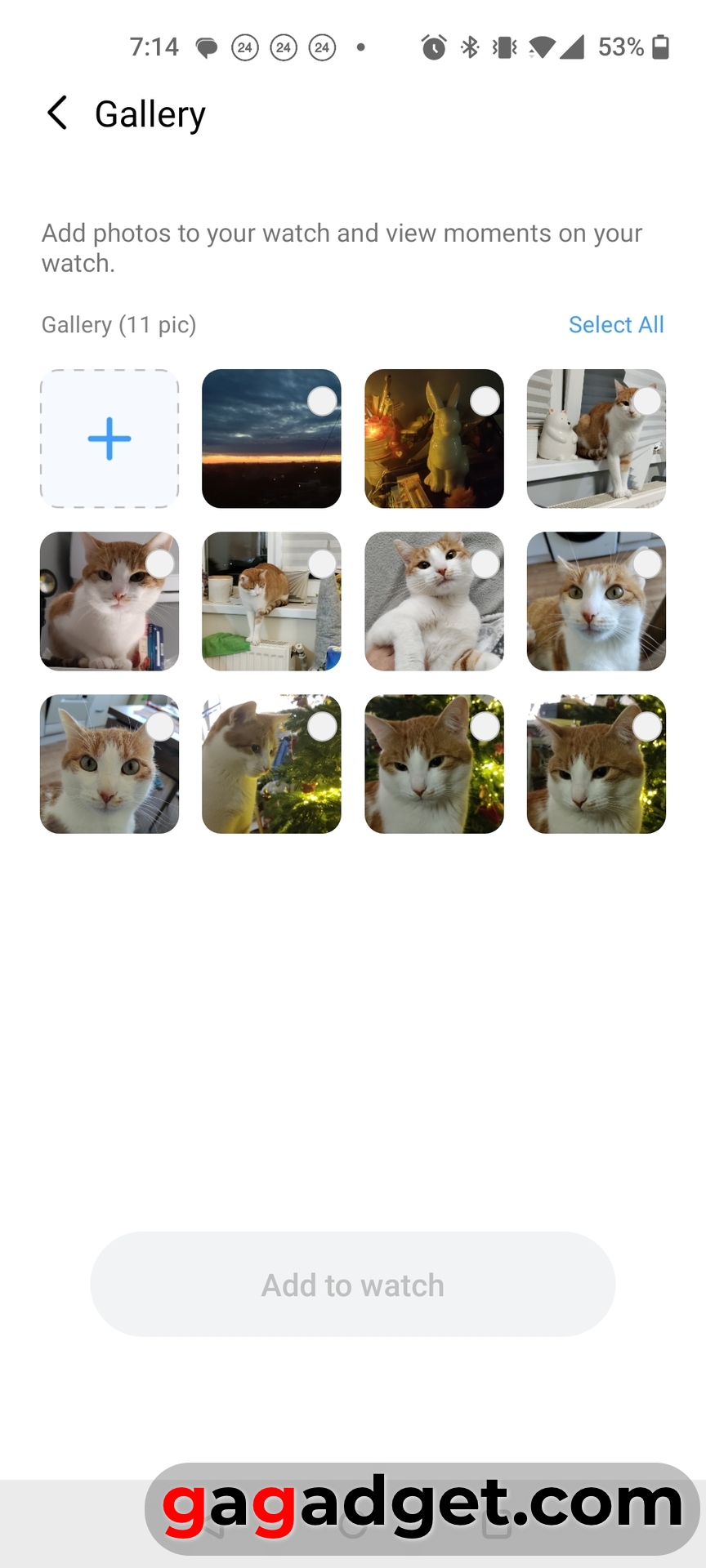 Galeria albumów. Podobnie jak w przypadku plików audio, można pobrać zdjęcia (do 50) do pamięci zegarka za pośrednictwem aplikacji Haylou Fun przez Bluetooth, a następnie przeglądać je tam. Jest funkcja automatycznego pokazu slajdów, a obrót kółka odpowiada za powiększenie zdjęcia (powinno być wygodne do ściągawek na egzamin). Możesz też przygotować zdjęcia z kodami kreskowymi kart rabatowych i mieć je zawsze przy sobie, nie na smartfonie, ale bezpośrednio w zegarku. Lub po prostu podziwiać kotki.