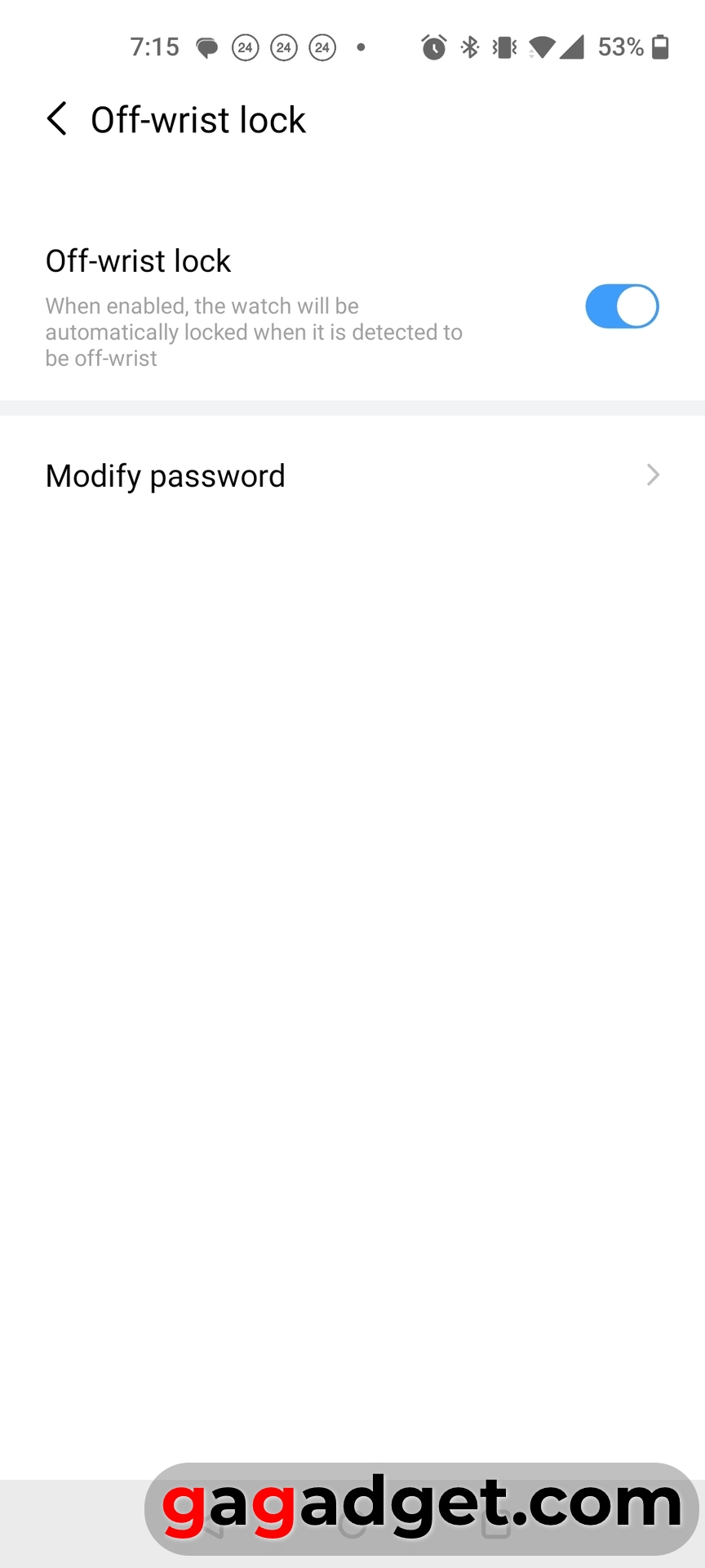 - opcja kodu PIN: w tym trybie, po zdjęciu zegarka z ręki, zostanie on automatycznie zablokowany i będzie wymagał wprowadzenia kodu PIN, aby uzyskać dostęp do jakichkolwiek funkcji z wyjątkiem przeglądania ekranu głównego.
