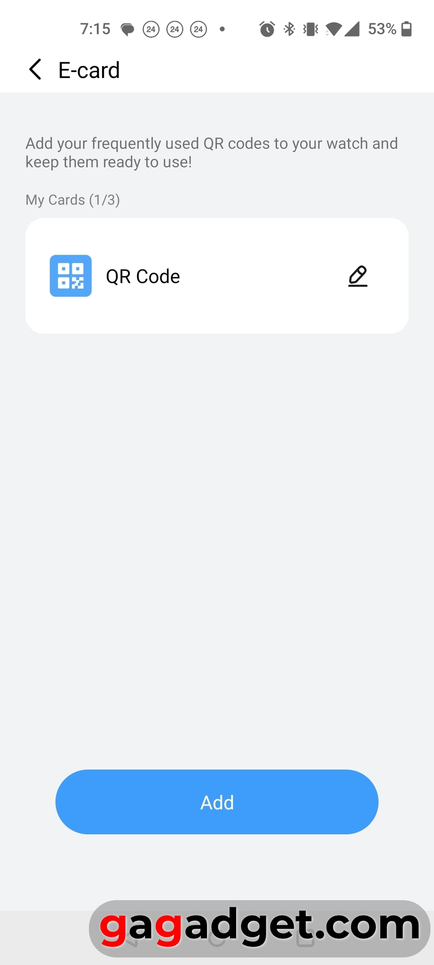 - elektroniczna pocztówka (tutaj sugerowane jest zapisywanie często używanych kodów QR, choć nie udało mi się ich jeszcze znaleźć w interfejsie zegarka);