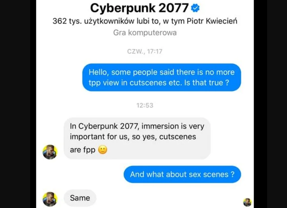 W korespondencji z oficjalnego konta na Twitterze Cyberpunk 2077 użytkowników sieci społecznej ujawnił, że grze nie będzie więcej scen od trzeciej osoby. Według przedstawiciela studia dla twórców ważne jest stworzenie wrażenia obecności, dla tego gracz będzie oglądać historię w pierwszej osobie. Odnosi się to do dialogu i scen seksu.