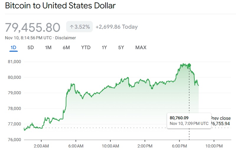Dziś (10 listopada) koszt Bitcoina po raz pierwszy przekroczył granicę 80 000 USD i nadal rośnie. Cena Bitcoina wzrosła o 6% do 80 948,66 USD, po czym nieznacznie spadła.