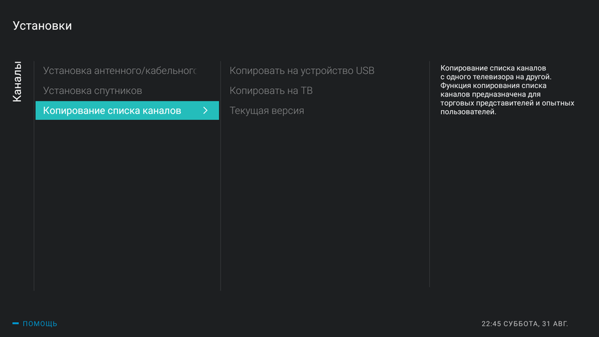 Kolejną funkcją dla doświadczonych użytkowników, którzy rozumieją, co robią, jest kopiowanie listy kanałów telewizyjnych z innego telewizora lub na dysk USB. Oczywiście teraz coraz częściej przechodzą na usługi OTT (w przeciwnym razie po co nam te wszystkie inteligentne telewizory w erze Internetu), ale komuś może się przydać i polubić się swoją wygodą. I fakt, że ktoś zadbał o zapewnienie takiej możliwości.
