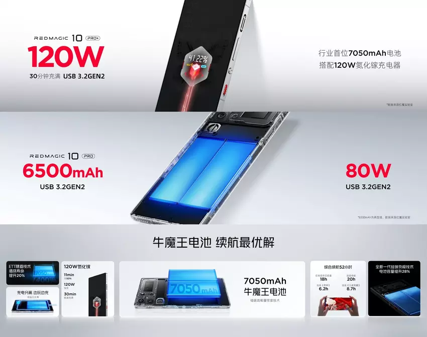 Oba urządzenia mają podobną specyfikację, ale różnią się w niektórych aspektach, w tym pojemnością baterii i mocą ładowarki. Red Magic 10 Pro ma baterię o pojemności 6500 mAh z ładowaniem 80 W, podczas gdy Pro+ ma baterię o pojemności 7050 mAh z ładowaniem 120 W. Jeśli chodzi o pamięć, Red Magic 10 Pro jest dostępny z 256 GB lub 512 GB pamięci głównej i 12 GB pamięci RAM, podczas gdy Pro+ jest dostępny z 512 GB lub 1 TB pamięci głównej i 16 GB lub 24 GB pamięci RAM. Wszystkie konfiguracje wykorzystują najnowszą pamięć RAM LPDDR5X i trwałą pamięć UFS 4.1 Pro.