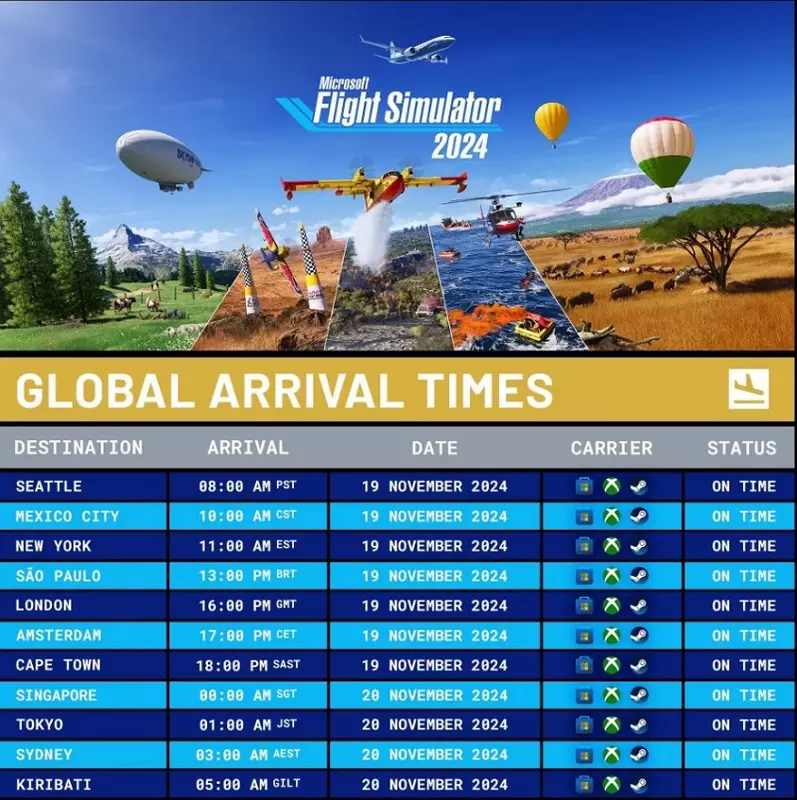 Twórcy kreatywnie podeszli do wizualizacji czasu premiery gry w różnych strefach czasowych i wystylizowali obraz pod harmonogram lotów. Flight Simulator 2024 będzie dostępny o godzinie 17:00 czasu środkowoeuropejskiego.