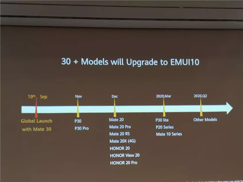 Opublikowana mapa drogowa jest dostarczana przez osoby trzecie z zewnątrz i nie jest oficjalna. Według źródła właściciele Huawei P30 i P30 Pro będą mogli przetestować ostateczną wersję EMUI 10 w listopadzie. W grudniu zostanie wydana aktualizacja dla Mate 20, Mate 20 Pro, Mate 20 RS i Mate 20X (4G), a także Honor 20, Honor 20 Pro i Honor V20. Serie P20, P30 Lite i Mate 10 otrzymają najnowszą aktualizację później - w marcu 2020 r. Pozostałe urządzenia nie są jeszcze wywoływane, dla nich EMUI 10 może być dostarczona dopiero latem 2020 roku.