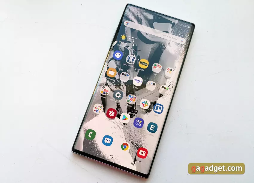 Smartfon okazał się duży i ciężki: 162,3x77,2x7,9 mm, 196 g, choć różnica z Note9 nie jest bardzo mała: 161,9x76,4x8,8 mm, waga 201 g. Przypomne, że przekątna wyświetlacza wzrosła z 6,4 do 6,8 cali. Oczywiście rozmiar smartfona nie jest odpowiedni dla wszystkich, ale dla miłośników modeli z dużymi ekranami są całkiem odpowiedni. Kształt obudowy jest dość wygodny (o ile to możliwe z uwzględnieniem wymiarów). Jedynym pytaniem jest lokalizacja przycisków. Używam smartfonów lewą ręką i bardzo szybko przyzwyczaiłem się do Samsunga Galaxy Note10 +. Wizualnie smartfon robi wrażenie, no i z montażem i materiałom wszystko jest w porządku, jak zawsze w przypadku flagowców Samsunga.