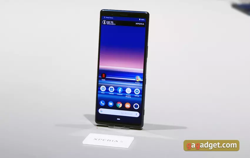 Kompaktową Xperia 5 można nazwać względnie. Z jednej strony. była linia Compact, w której były modele 4,5, 4,6 i 5 cali, na których 6,1 cala wygląda nieco za dużo. Ale jeśli weźmiemy pod uwagę obecne trendy zwiększania ekranu smartfonów już blisko 7 cali i proporcje ekranu Sony Xperia 5 21: 9, dzięki czemu smartfon okazał się wąski, termin „kompaktowy” jest już całkiem odpowiedni. Szerokość smartfona wynosi 68 mm. Dla porównania najbardziej „kompaktowy” obecny flagowy Samsung Galaxy S10e jest nieco szerszy, 69,9 mm. W przypadku osobistych wrażeń korzystanie ze smartfona jest całkiem wygodne jedną ręką.