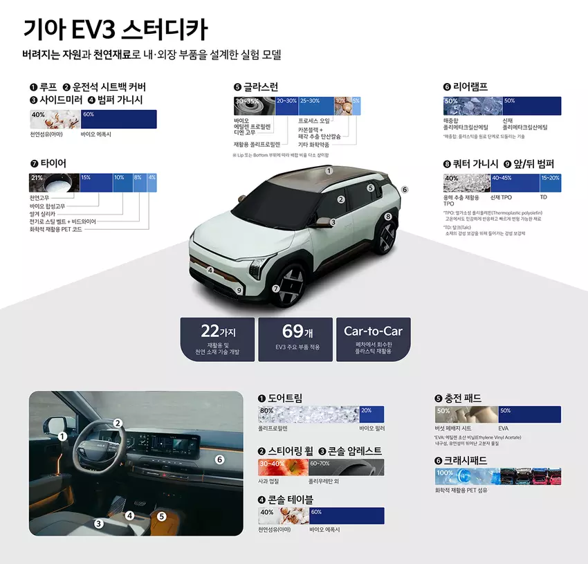 Koncepcja bazuje na produkcyjnym modelu Kia EV3, ale kluczowe panele nadwozia i wnętrza zostały zastąpione materiałami wykonanymi z tworzyw sztucznych pochodzących z recyklingu i biomateriałów. Łącznie opracowano 22 nowe technologie, które pozwoliły na modyfikację 69 części samochodu.