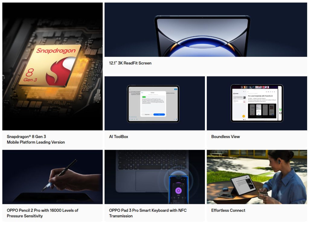 Urządzenie jest wyposażone w 12,1-calowy ekran LCD 3K z częstotliwością odświeżania 144 Hz i proporcjami 7:5 oraz obsługą Dolby Vision dla żywych efektów wizualnych. Tablet wyposażono w sześć głośników z technologią Dolby Atmos i wielokierunkowym dźwiękiem zapewniającym wciągające wrażenia dźwiękowe. Urządzenie jest zasilane przez procesor Snapdragon 8 Gen 3 Leading Edition i 12 GB pamięci RAM dla płynnej wydajności. Tablet działa na systemie Android 14 z powłoką ColorOS 14.1 i otrzyma aktualizację do Androida 15 w grudniu 2024 roku.