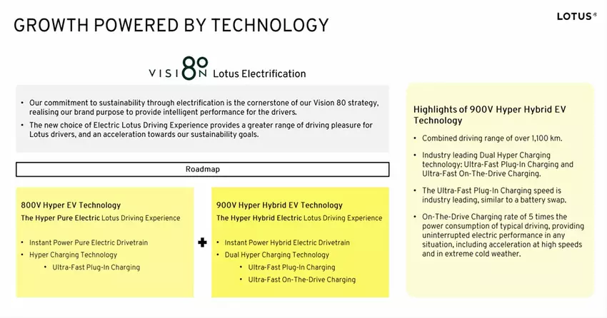 Lotus ogłosił zmianę w swojej strategii elektryfikacji Vision 80, która obejmie nową technologię Hyper Hybrid z architekturą 900-woltową. Modele hybrydowe otrzymają silnik benzynowy, co znacznie rozszerzy możliwości tych samochodów, w tym autonomię.