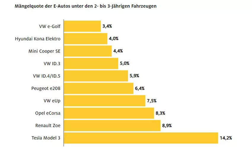 Drugi rok z rzędu sedan Tesla Model 3 zajął ostatnie miejsce w rankingu niezawodności samochodów w wieku poniżej 5 lat. Jest to ocena TÜV (Hauptuntersuchung), która opiera się na wynikach obowiązkowej kontroli stanu technicznego pojazdów poruszających się po niemieckich drogach. Kontrola obejmuje ponad 160 punktów, w szczególności stan hamulców, zawieszenia, oświetlenia, układu kierowniczego i ogólnej struktury.