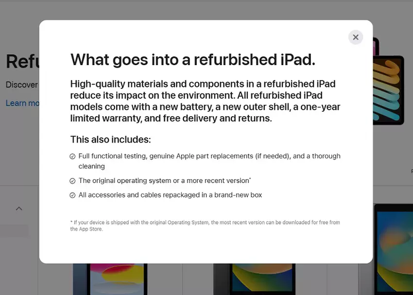Apple podkreśla, że odnowione iPady posiadają nowe baterie i obudowy zewnętrzne i są sprzedawane w nowych pudełkach z instrukcjami i akcesoriami, w tym kablem USB-C do ładowania i zasilaczem.