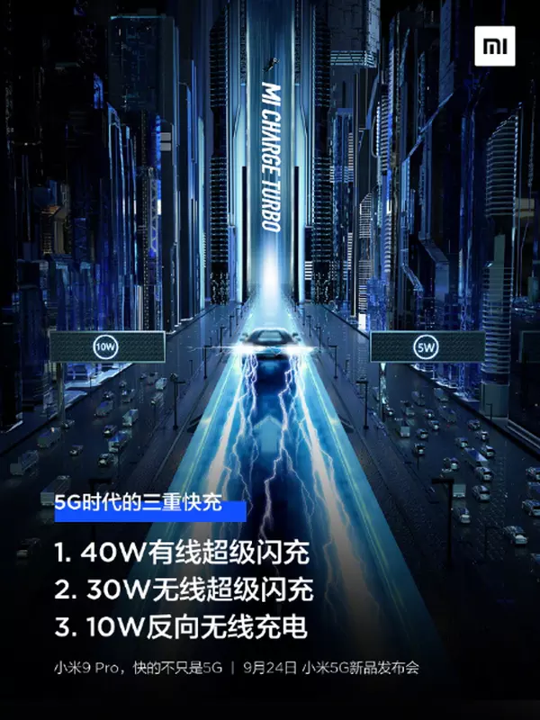 Według opublikowanego plakatu na portalu społecznościowym Weibo nowość będzie mogła pochwalić się nie tylko potężnym „wypychaniem” i obsługą 5G, ale także szybkim ładowaniem przewodowym o mocy 40 watów, bezprzewodowe ładowanie Mi Charge Turbo o mocy 30 watów i ładowania zwrotnego przy 10 watach. Z tych możliwości, bateria w smartfonie na 4000 mAh przez drut można będzie naładować w czasie krótszym niż godzina, i bezprzewodowym sposobem - za 70 minut.