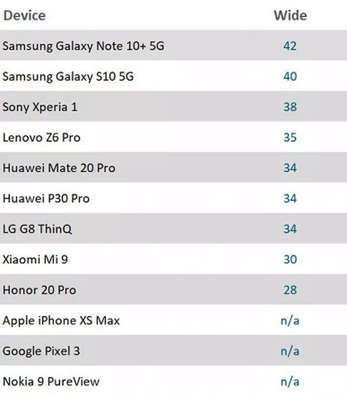 Według jakości kamery szerokoekranowej w pierwszej trójce ocen Samsung Galaxy Note10 + 5G, Galaxy S10 5G i Sony Xperia 1.