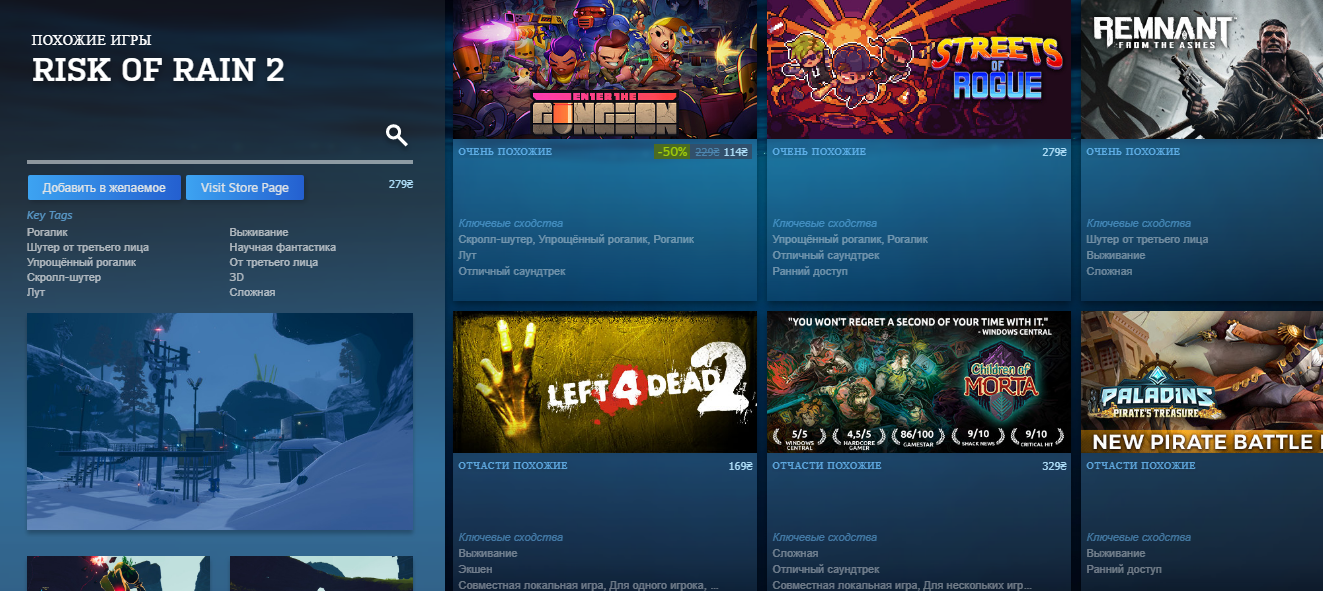 O „Zanurzeniu” wspomnieliśmy nawet w ostatnim biuletynie. Funkcja ta pokazuje podobne gry w poszukiwaniu konkretnego projektu. Na przykład, jeśli gracz szuka Risk of Rain 2, to w rezultacie wyszukiwania zobaczy jeszcze dziewięć podobnych gier które są podzielone na bardzo podobne, nieco podobne, i podobne, ale niepopularne.
