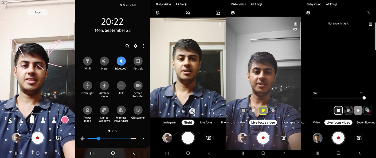 Przede wszystkim, to są nowe funkcje kamery: tryb nocny dla przedniej kamery, AR Doodle (tylko czołowy), żywe skupienie (dokładniej, nowy efekt Glitz Live focus), żywe skupienie dla wideo i Super steady (ultrastabilny) dla wideo.
