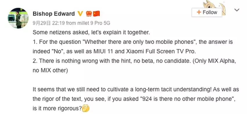 Pomimo faktu, że flagowy model Mi Mix Alpha zostanie wydany w ograniczonej liczbie, nie należy spodziewać się innych smartfonów Mix w 2019 roku. Zostało to ogłoszone przez menedżera marki firmy Edwarda Bishopa (Edward Bishop), odpowiadając na pytania użytkowników w sieci społecznościowej Weibo. Teraz producent przygotowuje się do rozpoczęcia sprzedaży Mi Mix Alpha i skoncentruje się na jego promocji.