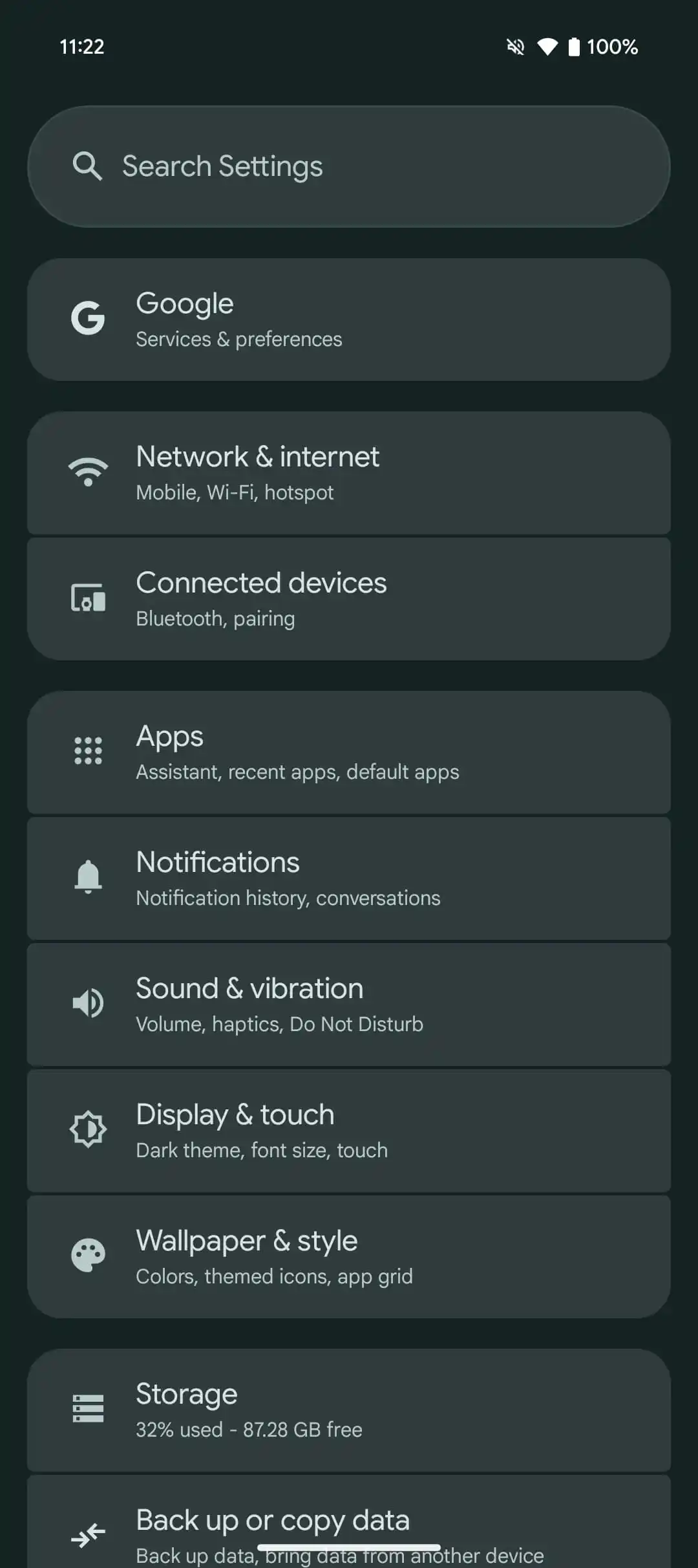 Aktualizacja wprowadza przeprojektowanie ustawień Material You, które obejmuje zakotwiczony pasek wyszukiwania i nowe karty menu. Wskaźniki transmisji, nagrywania i udostępniania pojawiają się teraz po lewej stronie z widocznym licznikiem.