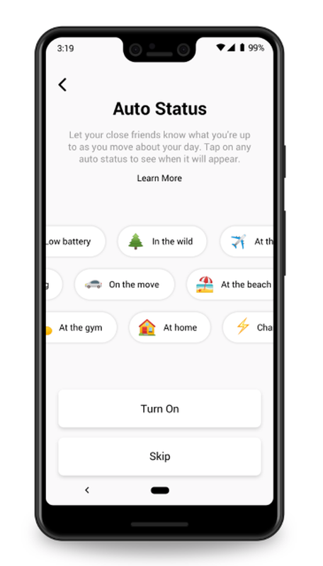 Główną cechą Wątków są statusy emoji. Możesz zainstalować je ręcznie lub włączyć funkcję automatycznej zmiany w ustawieniach. Według lokalizacji aplikacja ustawi dla ciebie status. Na przykład, jeśli jesteś na lotnisku, wówczas status będzie na lotnisku, jeśli w domu - w domu itp. Według twórców firma nie ujawni dokładnych współrzędnych użytkowników.