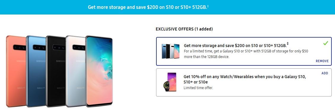 W rezultacie Galaxy S10 i Galaxy S10 + 512 GB ze zniżką są tylko o 50 USD droższe niż wersje z mniejszą pamięcią.