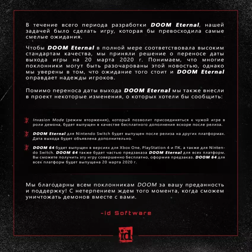 Teraz gracze będą mogli grać w DOOM Eternal już 20 marca 2020 r. W liście przewodnim twórcy z id Software napisali, że projekt musi spełniać wysokie standardy jakości, a to wymaga więcej czasu. „Ukończyć grę” to szlachetna sprawa i wydaje się, że programiści mają wiele do zrobienia.
