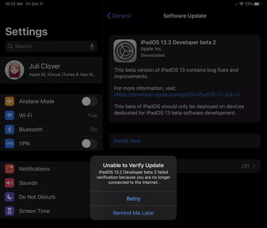 Apple nie skomentował jeszcze tych informacji. Ale dystrybucja aktualizacji jest zawieszona: podczas próby zainstalowania iPada 13.2 beta 2 pojawia się komunikat o błędzie.