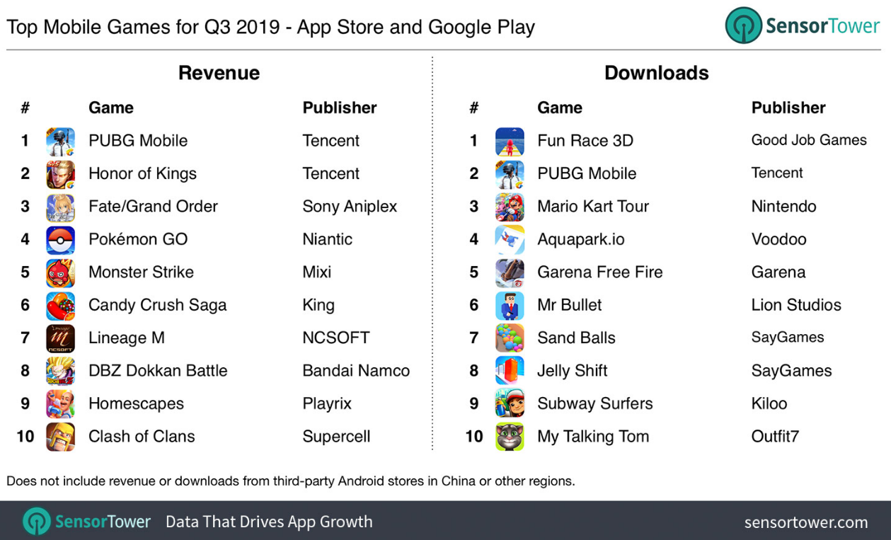 Jednocześnie Pokemon Go, choć zajął tylko czwarte miejsce, ale według Sensor Tower wykazał najszybszy wzrost zysku. W trzecim kwartale gra zarobiła 308 milionów dolarów, czyli o 63% więcej niż w drugim kwartale. Przychody Mario Kart Tour nie były wystarczające, aby dostać się do najlepszych gier dla zysku, ale projekt zajął trzecie miejsce w rankingu najczęściej pobieranych projektów.