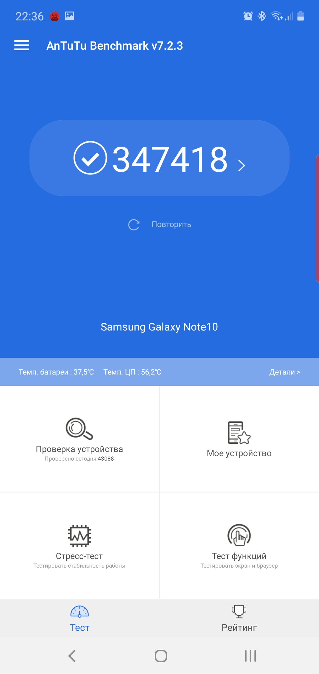 Jeśli chodzi o „wypełnianie” Samsunga Galaxy Note10 prawie całkowicie powtarza " Plus ": 7-nm Samsung Exynos 9825 o maksymalnej częstotliwości taktowania 2,73 GHz, moduł uczenia maszynowego Neural Processing Unit (NPU) i akcelerator graficzny ARM Mali-G76 MP12. Pamięć RAM jest nieco mniejsza: 8 GB zamiast 12 GB pamięci RAM i 256 GB wbudowanej, najszybszy w tej chwili UFS3.0, ale bez możliwości rozszerzenia. Wydaje mi się, że 256 GB wystarcza, chociaż nie wykluczam istnienia użytkowników, którzy zatkają pamięć zdjęciami i wideo 4K. Oczywiście nie ma problemów z wydajnością. W testach syntetycznych smartfon osiąga najlepsze wyniki, choć tradycyjnie pod względem ciężkiej grafiki najlepsze rozwiązania Qualcomm wygrywają trochę: