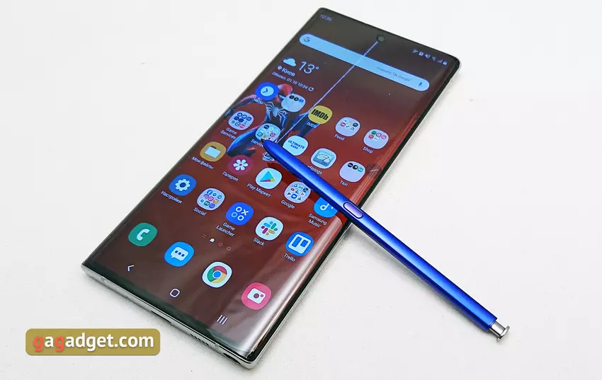 Jeśli chodzi o „wypełnianie” Samsunga Galaxy Note10 prawie całkowicie powtarza " Plus ": 7-nm Samsung Exynos 9825 o maksymalnej częstotliwości taktowania 2,73 GHz, moduł uczenia maszynowego Neural Processing Unit (NPU) i akcelerator graficzny ARM Mali-G76 MP12. Pamięć RAM jest nieco mniejsza: 8 GB zamiast 12 GB pamięci RAM i 256 GB wbudowanej, najszybszy w tej chwili UFS3.0, ale bez możliwości rozszerzenia. Wydaje mi się, że 256 GB wystarcza, chociaż nie wykluczam istnienia użytkowników, którzy zatkają pamięć zdjęciami i wideo 4K. Oczywiście nie ma problemów z wydajnością. W testach syntetycznych smartfon osiąga najlepsze wyniki, choć tradycyjnie pod względem ciężkiej grafiki najlepsze rozwiązania Qualcomm wygrywają trochę: