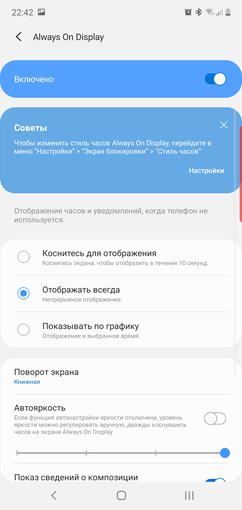 Smartfon ma 6,3-calowy wyświetlacz Dynamic AMOLED o zakrzywionych bokach i wydłużonym współczynniku proporcji 19: 9 oraz okrągły dekolt kamery przedniej. Rozdzielczość wynosi 2280 x 1080 (FullHD +), gęstość pikseli - 401 ppi (w porównaniu z 3040 x 1440 i 498 ppi dla większego modelu). Reszta wszystko jest prawie takie samo jak w starszym modelu: twierdzą, że obsługuje HDR10 +, 100% gama kolorów DCI-P3. Wizualnie wyświetlacz jest całkiem dobry. Pomimo mniejszej gęstości pikseli obraz nie wygląda na „luźny”, a czcionki są wyraźne. Ustawienia prawie całkowicie powtarzają starszy model: czarny interfejs, skalowane elementy interfejsu, regulacja czcionek, niebieski filtr, możliwość ukrywania wyłącznika kamery i Always On Display. Na miejscu Zniknęła jedynie możliwość wyboru rozdzielczości ekranu: