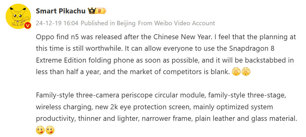 Post insidera Smart Pikachu na temat możliwych specyfikacji Oppo Find N5. Ilustracja: Weibo