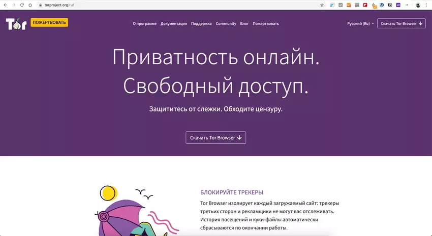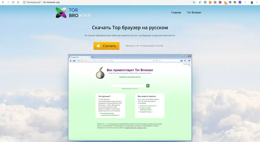 W pierwszym etapie atakujący tworzą fałszywą stronę internetową przeglądarki Tor w języku rosyjskim. Paradoks tej sytuacji jest to, że nawet nie kopiować oryginalne witryny, znajdujący się pod adresem torproject.org/ru/. Ale porozmawiajmy przekonująco o korzyściach płynących z anonimowości w Internecie, dzięki jego możliwością. Oficjalna strona projektu wygląda w następujący sposób: