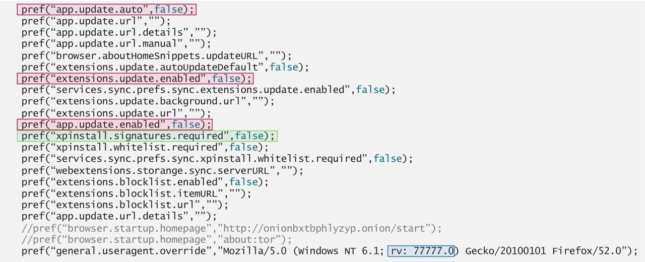Następujące zmiany pojawiły się w ustawieniach zainfekowanej przeglądarki (wyróżnione kolorem), dotyczą one blokowania aktualizacji.