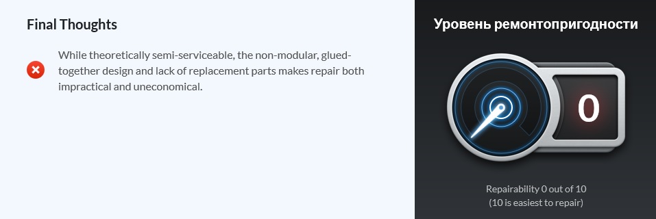 W rezultacie słuchawki Apple AirPods Pro otrzymały 0 z 10 możliwych punktów za łatwość konserwacji. Oznacza to, że nie można ich rozmontować i naprawić bez całkowitego zepsucia.