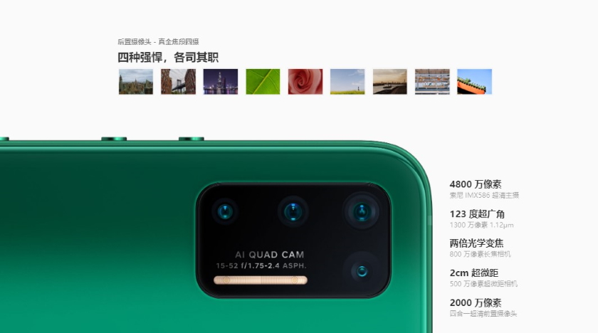 Smartfon otrzymał trzy obudowy kolorowe i kamerę główną z czterema modułami. W białej wersji konstrukcja kamery nieco różni się od czarnego i zielonego modelu. Główny czujnik urządzenia jest Sony IMX586 na 48 Mp. Jego dopełnia „shirik” na 12 Mp z kątem pokrycia 123 stopnie, 8-megapikselowy tele i 2-megapikselowa kamera dla zdjęcia makro z ogniskową 2 cm. Kamera ma tryb nocny strzelania i jest w stanie rejestrować wideo Slow-Motion w 480fps.