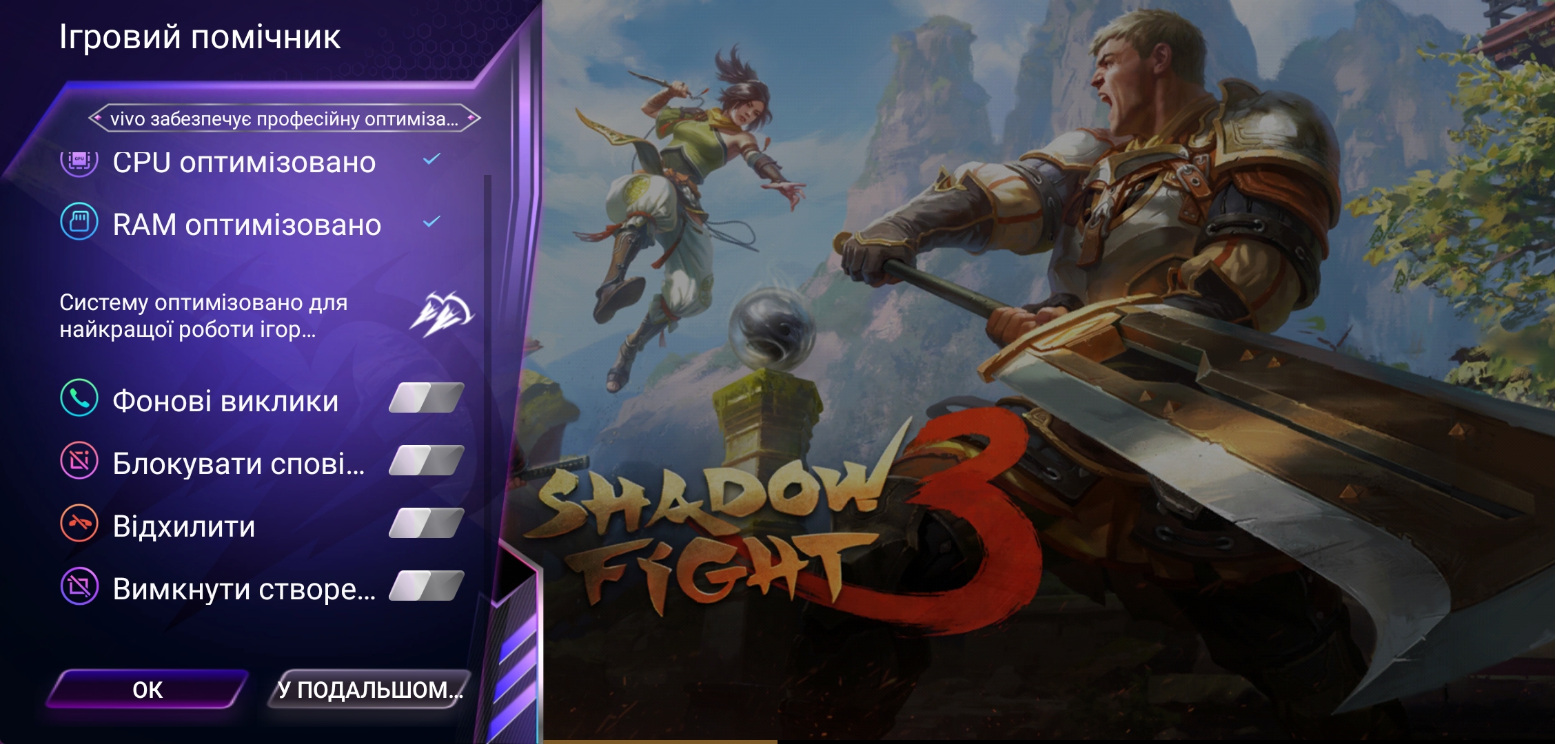 Podobnie jak w przypadku każdego innego nowoczesnego smartfona, istnieje dodatkowe narzędzie do gier. W przypadku Vivo NEX 3 „optymalizuje” system podczas uruchamiania (innymi słowy, czyści pamięć RAM i to wszystko) i umożliwia blokowanie różnego rodzaju powiadomień podczas gry. Z nietypowych funkcji jest tryb „auto-play” (gra nadal działa poza ekranem):