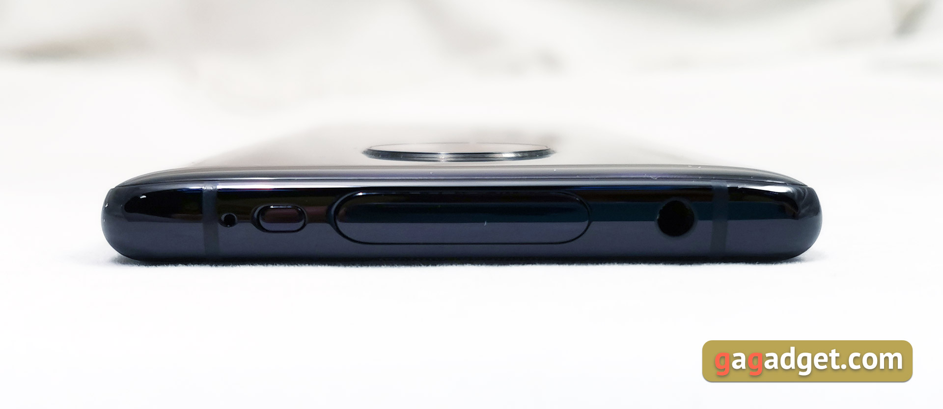 Oprócz modułu przedniej kamery, w górnej części znajduje się mikrofon, standardowe gniazdo słuchawkowe 3,5 mm i bardzo mały mechaniczny przycisk zasilania. Na początku myślałem, że to nadajnik IR. W rzeczywistości inżynierowie postanowili zostawić coś w rodzaju „zapasowego” przycisku zasilania. Nie przeszkadza, nie wystaje ponad obudowę i nigdy nie był użyteczny podczas użytkowania.