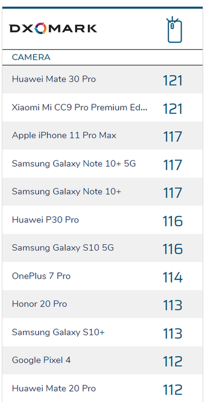 Całkowity wynik   iPhone11 Pro Max - 117. Do liderów rankingu Huawei Mate Pro 30 i  Xiaomi Mi CC9 Pro ma dosyć daleko (one mają 121 punkt), ale ten sam wynik ma Samsung Galaxy Note 10+ 5G i Samsung Galaxy Note 10+.