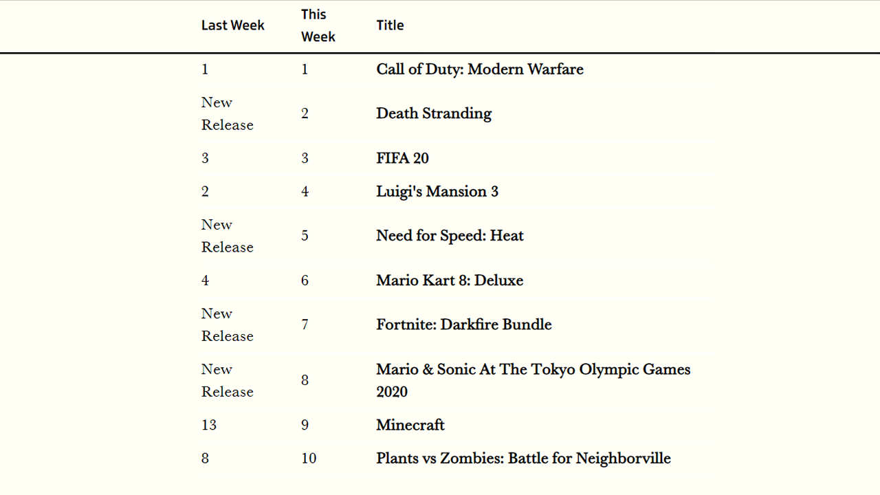 Mimo to Death Stranding była w stanie wyprzedzić Luigi's Mansion 3, ekskluzywny Nintendo Switch, który spadł z drugiego na czwarte. FIFA 20 również tu odegrała rolę, zajmując trzecie miejsce na liście. Jednocześnie Need for Speed: Heat, najnowsza gra EA, nigdy nie przekroczyła piątej pozycji. Gamesindustry.biz zauważa, że sprzedaż projektów stanowiła 41% ogólnej liczby Need for Speed: Payback.