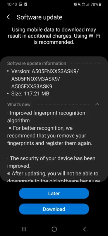Jest to już druga aktualizacja listopadowa do urządzenia. Oprogramowanie układowe otrzymało numer kompilacji A505FNXXS3ASK9 i, oczywiście, zawiera aktualną poprawkę zabezpieczenia. Ale główną innowacją oprogramowania jest ulepszony algorytm do odczytu linii papilarnych. W związku z tym, producent zaleca nawet po aktualizacji ponownie dodać je do systemu.