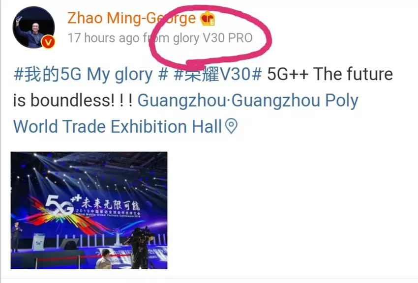 Zhao Ming uczestniczył w China Mobile Global Partners Conference 2019 i napisał post na Weibo z hashtagiem #Honor V30.