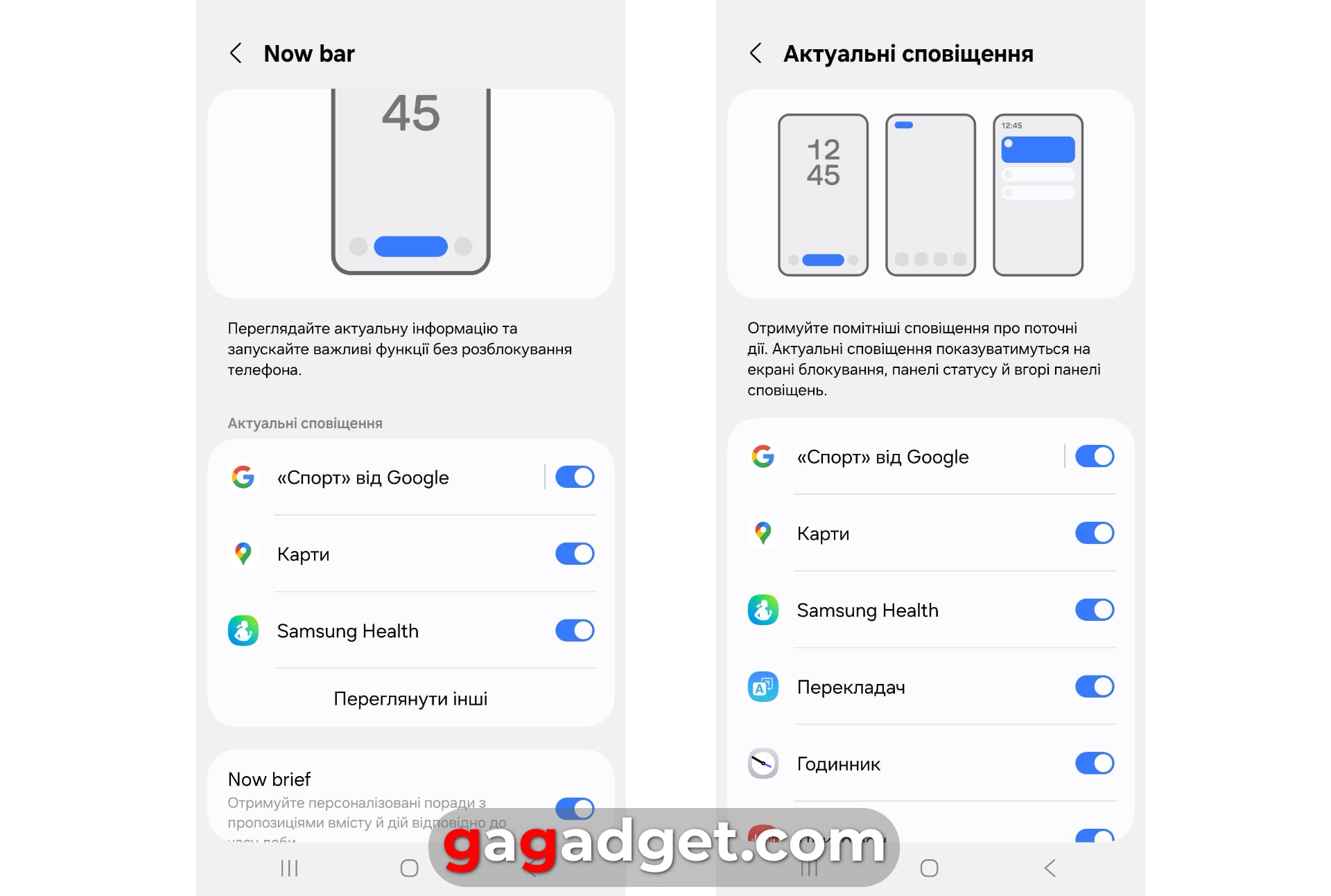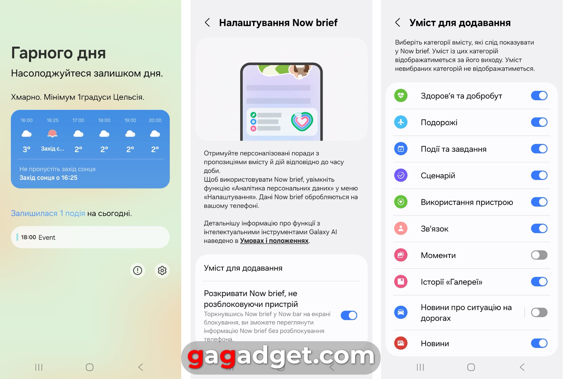Panel Now Brief i jego ustawienia. Zrzuty ekranu: gagadget
