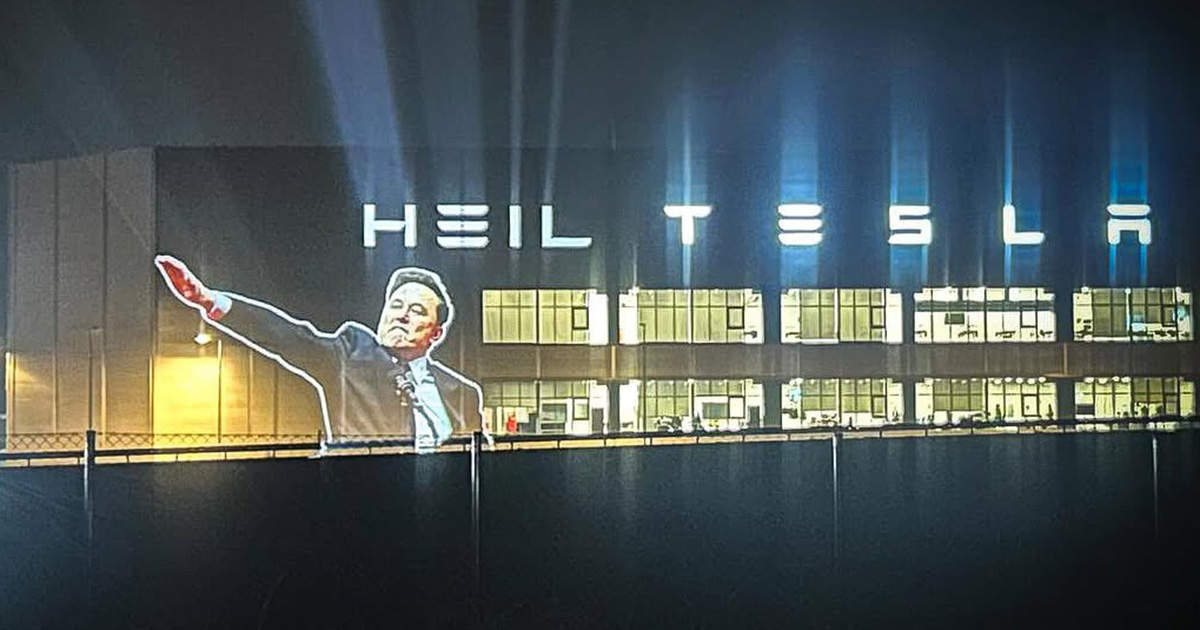 W środę wieczorem, 22 stycznia, aktywiści użyli projektora, aby wyświetlić zdjęcie miliardera i właściciela Tesli Elona Muska na fasadzie fabryki samochodów elektrycznych Tesla Gigafactory Berlin-Brandenburg w Grünheide w Niemczech. Zdjęcie, zrobione podczas przemówienia na wiecu w Waszyngtonie po inauguracji 47. prezydenta USA Donalda Trumpa, przedstawia Muska wykonującego nazistowski salut prawą ręką.