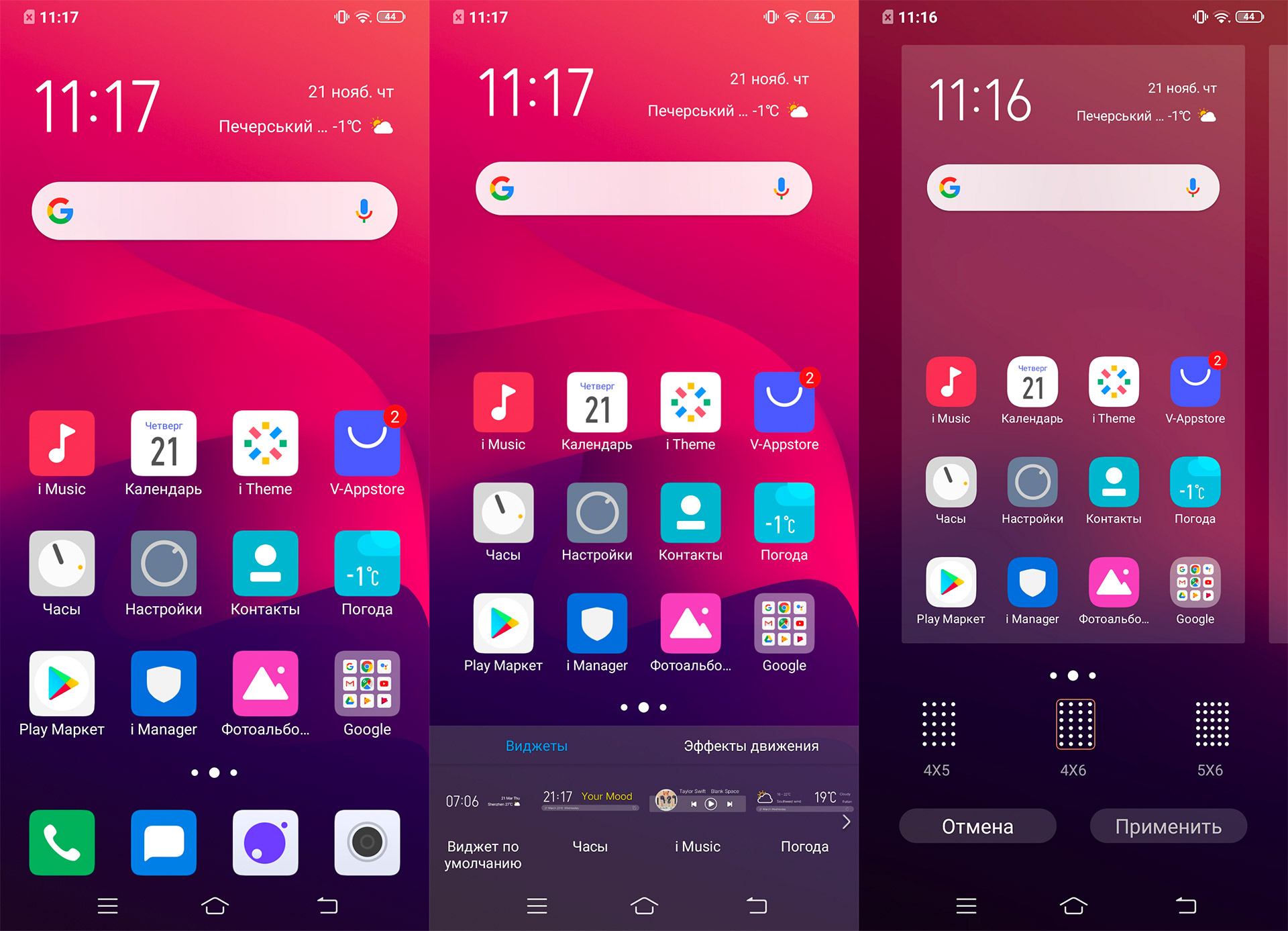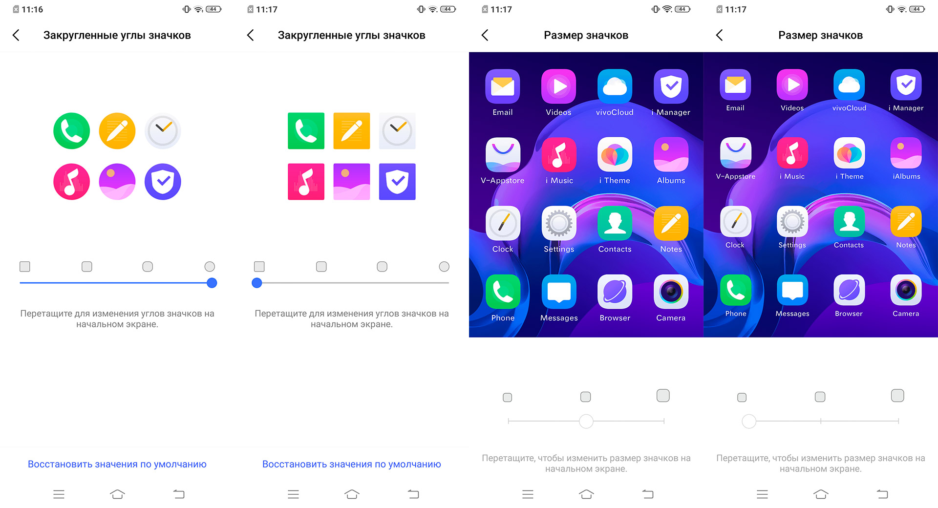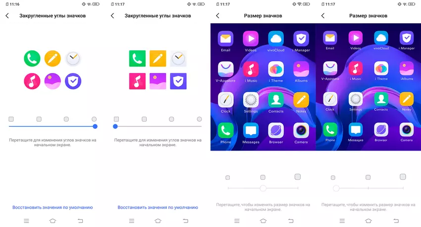 Tradycyjnie producenci całkowicie (lub prawie całkowicie) przerysowują wygląd systemu operacyjnego nie do poznania. Począwszy od ikon, czcionek, schematów kolorów i kończąc na wszystkich animacjach. Tak więc w Funtouch OS: wszystko jest przerysowane, istnieją różne motywy, w tym te do pobrania. Można zmienić rozmiar czcionki (i samą czcionkę). Ikony można również dostosowywać, ale nie tylko pod względem wielkości. Możliwe jest wybranie ich kształtu od kwadratowego do okrągłego z opcjami pośrednimi.