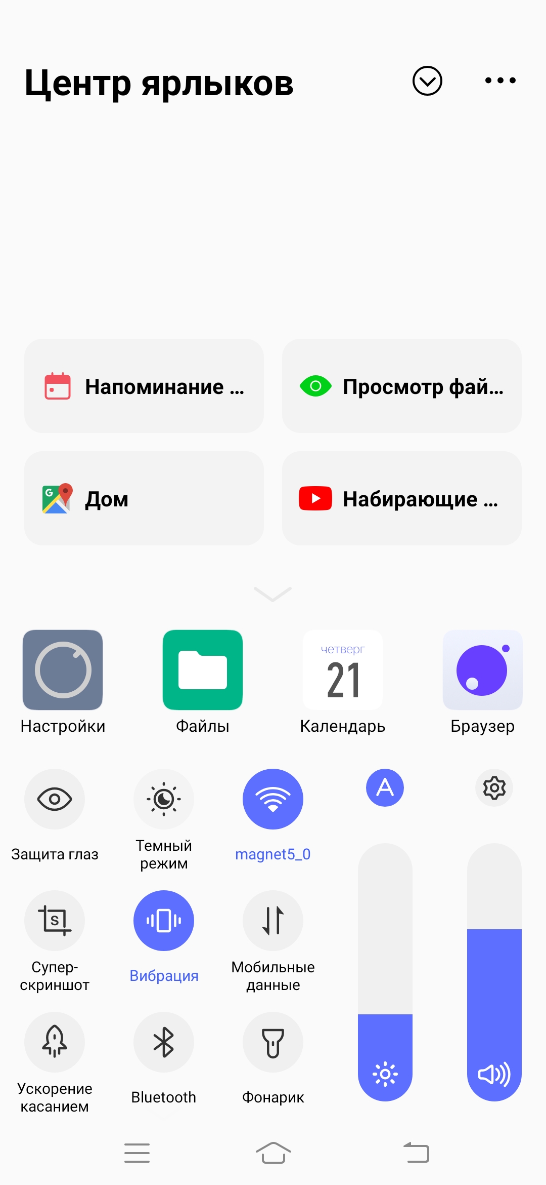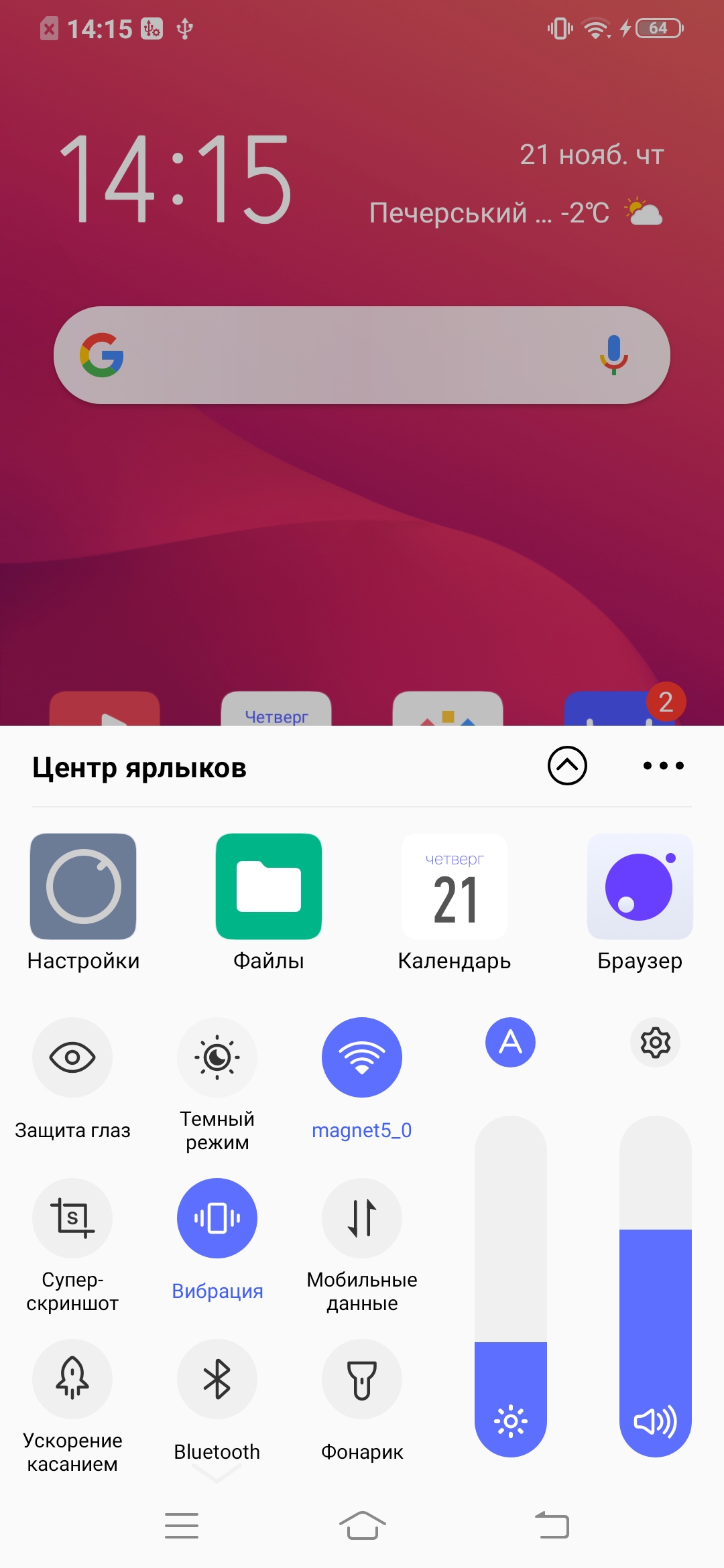 Jedną z najbardziej niezwykłych cech Funtouch OS jest obecność dwóch „zasłon” zamiast jednej. Górna, znajoma odpowiada tylko za powiadomienia. Cała reszta (w tym regulacja jasności i głośności, wszystkie skróty do Wi-Fi, Bluetooth itp.) Są umieszczone w dolnej kurtynie zwanej Centrum skrótów, która przypomina logikę w iOS. Prawdopodobnie programiści kierowali się chęcią wygodniejszego sterowania jedną ręką na smartfonach z dużymi ekranami. Po lewej stronie znajduje się przewijalny obszar ze skrótami, po prawej - suwaki jasności i głośności, a powyżej - panel z tymi samymi szybkimi poleceniami. Można wybrać do 8 sztuk. W tym szybkie dołączanie map i wskazówki dojazdu do domu, uruchamianie subskrypcji YouTube i tak dalej.
