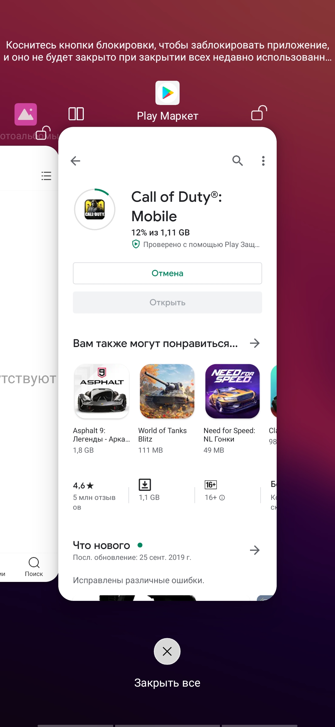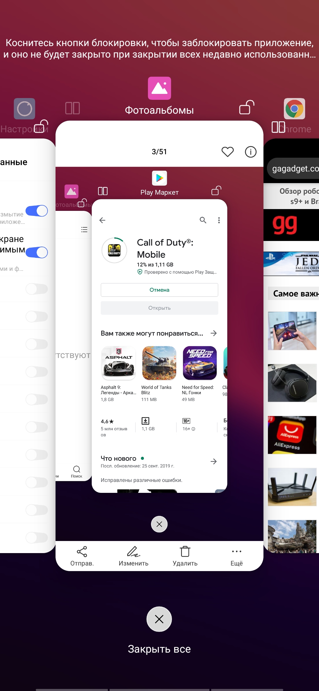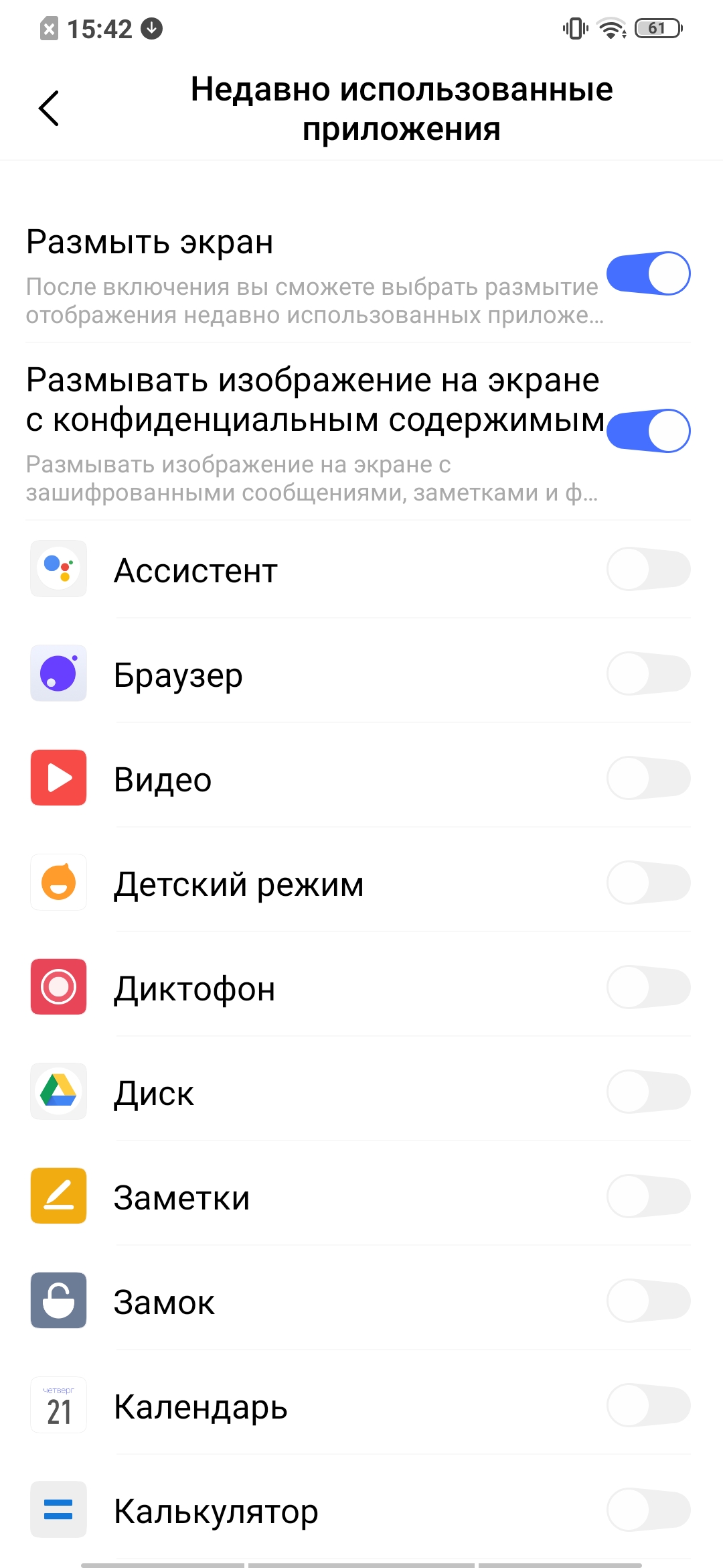 Menedżer aplikacji wygląda prawie standardowo: pozioma karuzela kart. Nad kartami znajdują się dwa przyciski: do przełączania w tryb okna i do zabezpieczania aplikacji (pozostanie uruchomiona, jeśli zamkniesz resztę przyciskiem). Z dodatkowych funkcji - możesz wybrać określony zestaw aplikacji, które będą niewyraźne w menedżerze aplikacji.